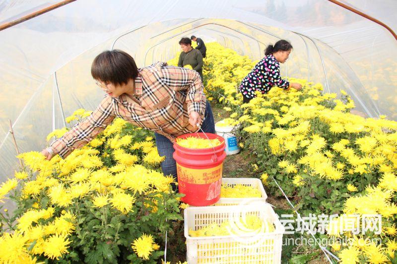 11月4日,在位于闻喜县桐城镇上白土村的山西新桐农业开发有限公司健康菊花园里,农民们喜摘金丝皇菊花。