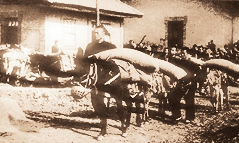 晋绥边区群众交军粮支援抗战。