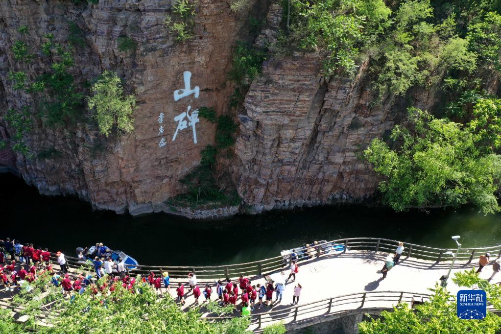 游客在河南林州红旗渠畔参观(2019年5月22日摄,无人机照片)。新华社记者 冯大鹏 摄