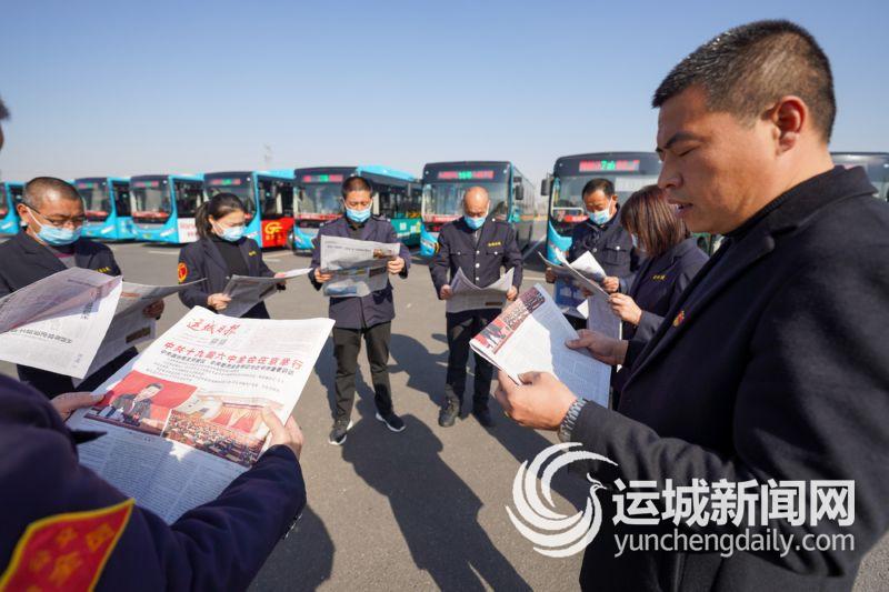 11月14日,在运城高铁北站公交枢纽中心,公交车司机在集体学习党的十九届六中全会精神。大家纷纷表示,要以史为鉴、开创未来,带着传承不变的初心和使命,接过时代的接力棒,将个人命运与国家命运深深地融合在一起,争做新时代的奋斗者。