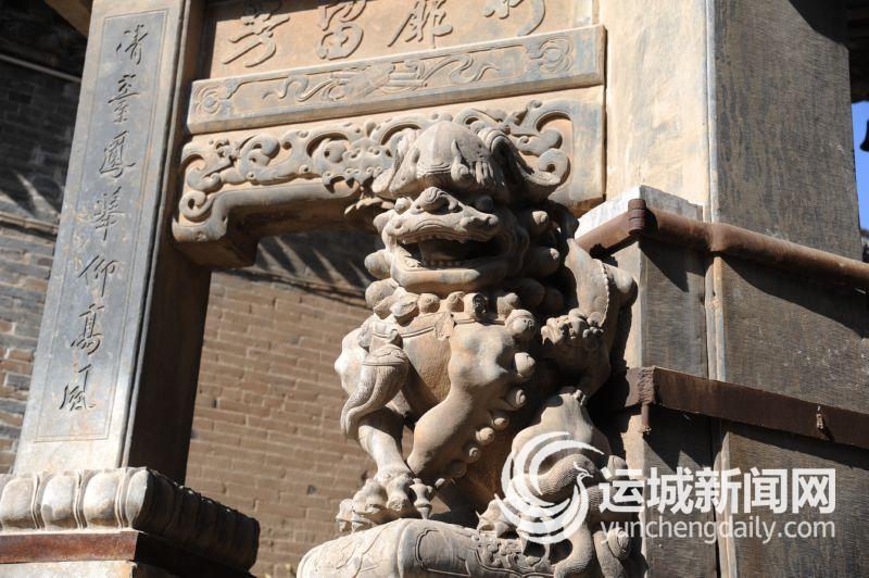 石匾“旌表”两侧刻有门神,栩栩如生;下方横柱上浮雕是牌坊原主李恭人贺寿场景,惟妙惟肖;最下层横柱上雕着代表福禄寿的花卉、走兽、人物,活灵活现。整个石牌坊上还雕刻了许多赞扬女性品德的字样,但是最为特别的还当属石牌坊最下面两侧石柱前的石狮。