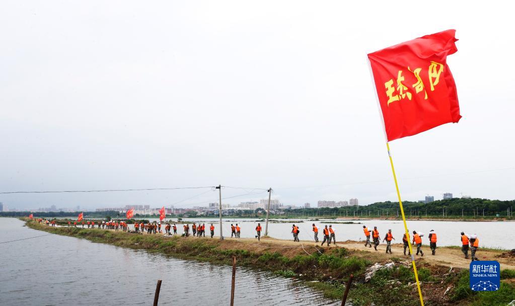 陆军第71集团军某合成旅王杰生前所在连官兵跟随部队在江西共青城市共青联圩共大圩段加固防洪堤坝(2020年7月19日摄)。新华社发(李志浩 摄)