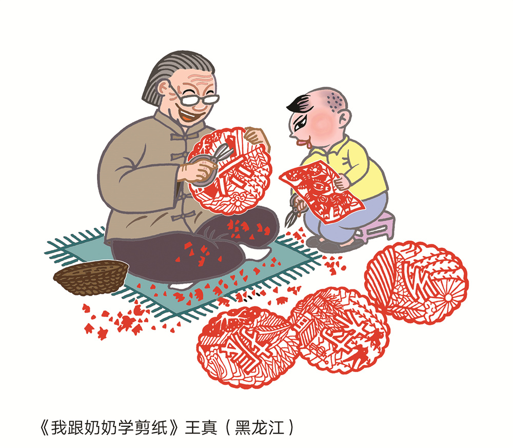 点评:剪纸是最古老的中国民间艺术之一,奶奶指导孙子剪纸,是传承祖国的传统文化;剪纸剪出“乡村振兴”,是奶奶生活富裕后的心声,也是我们这一代人的心声。