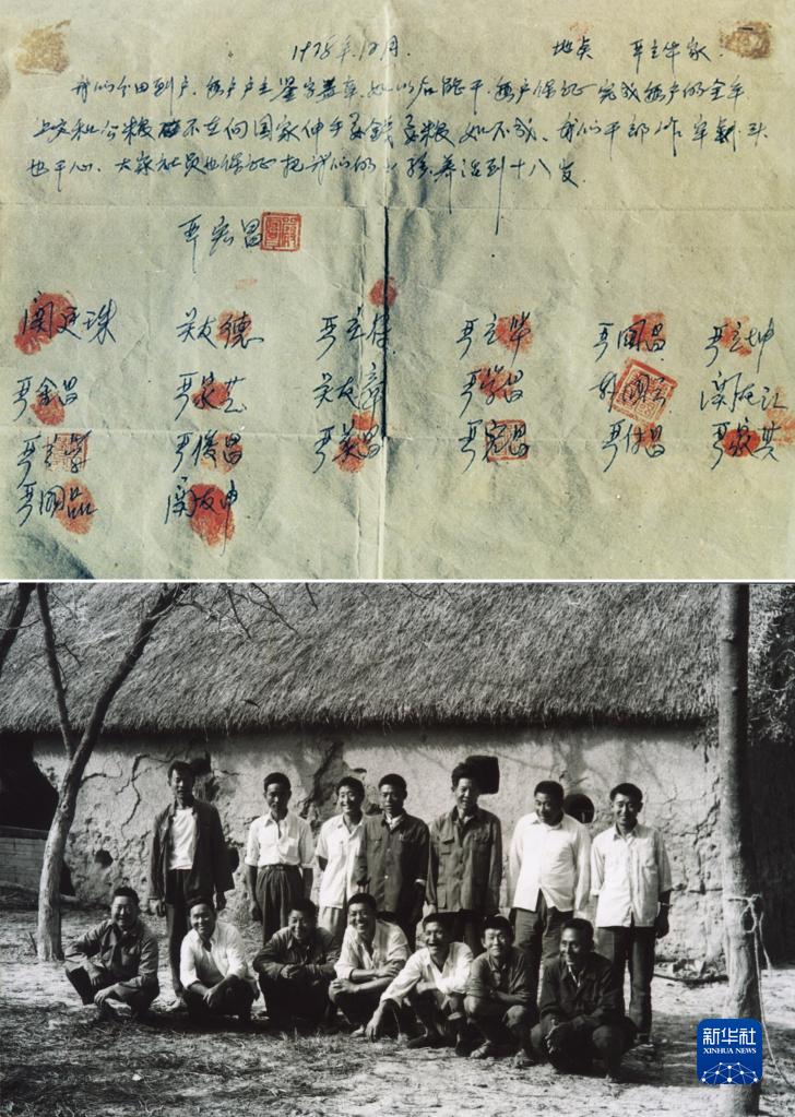 这是一张拼版照片:上图为1978年冬,18位农民按下红手印的“大包干”契约(资料照片);下图为1981年,部分“大包干”带头人在茅草屋农舍前合影(资料照片)。新华社发