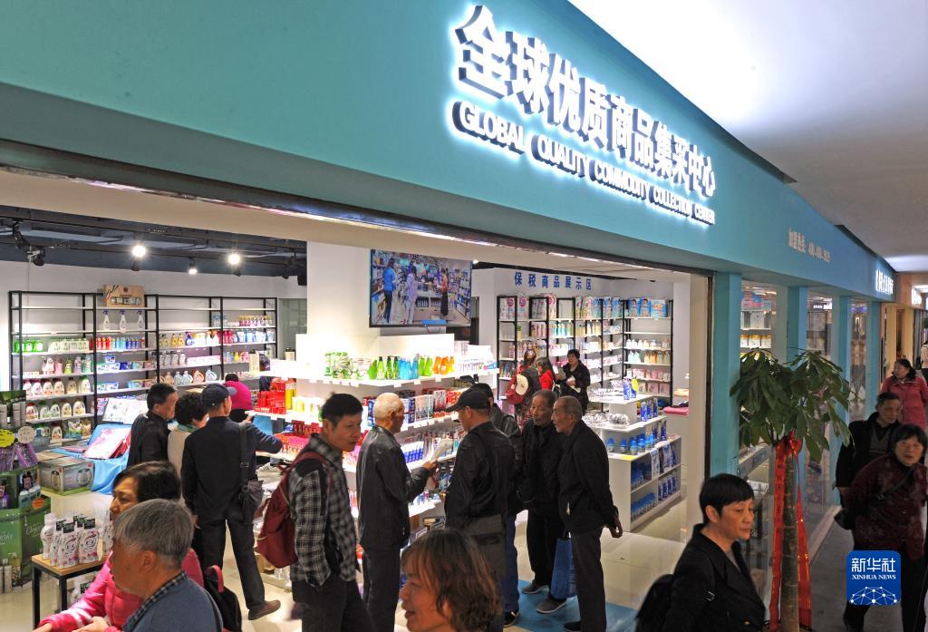 浙江义乌中国进口商品城孵化区的一家跨境电商平台实体店吸引不少消费者(2019年11月23日摄)。新华社记者 谭进 摄