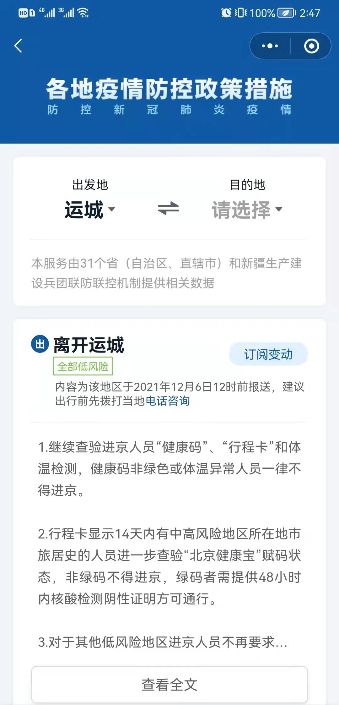 如果你是离运人员,可输入目的地,查询目的地新冠疫情防控政策