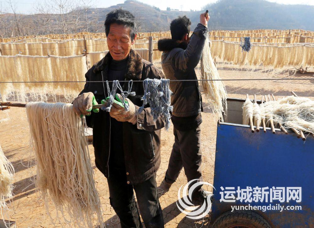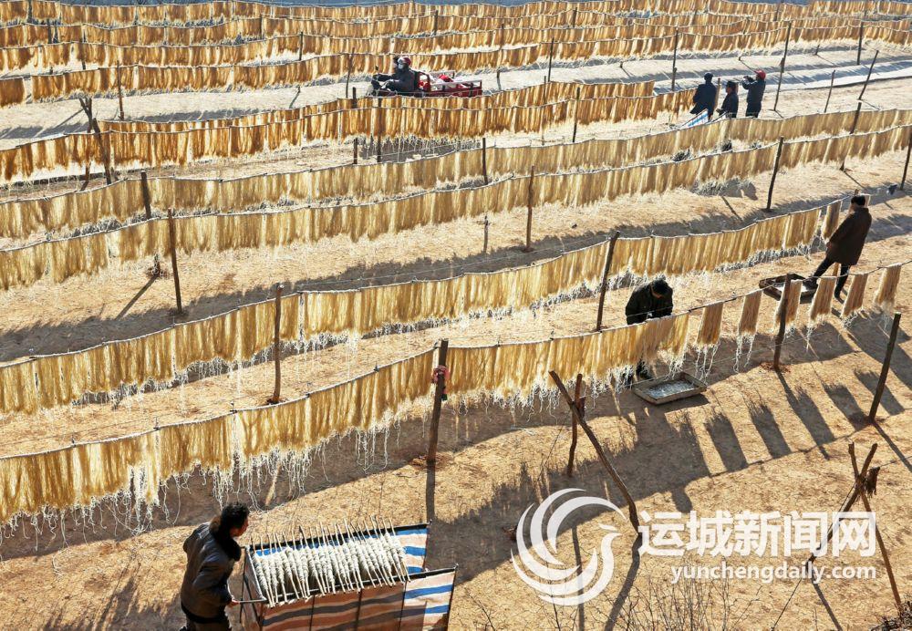 12月5日,垣曲县墨山底村村民在晾晒粉条。该村有上百年的粉条加工历史,近年来,规模种植红薯500亩,年可加工粉条10万公斤,为村民增加收入150多万元。连日来,村里家家户户忙着加工粉条,到处是晾晒粉条的壮观场景。