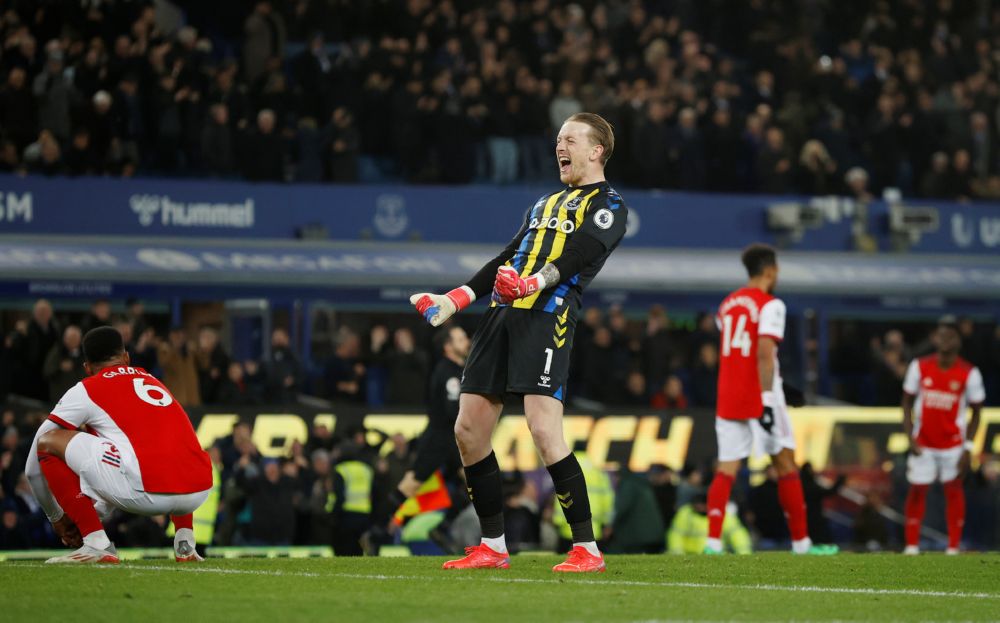 12月6日,埃弗顿队门将皮克福德在比赛后庆祝胜利。当日,在2021~2022赛季英格兰足球超级联赛第15轮比赛中,埃弗顿以2比1战胜阿森纳队。
