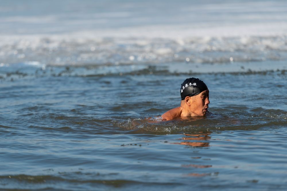 12月7日,冬泳爱好者在松花江哈尔滨段一冬泳池中游泳。当日是“大雪”节气,“冰城”哈尔滨的冬泳爱好者们破冰开池、畅游松花江,锻炼身体的同时尽享冬趣。