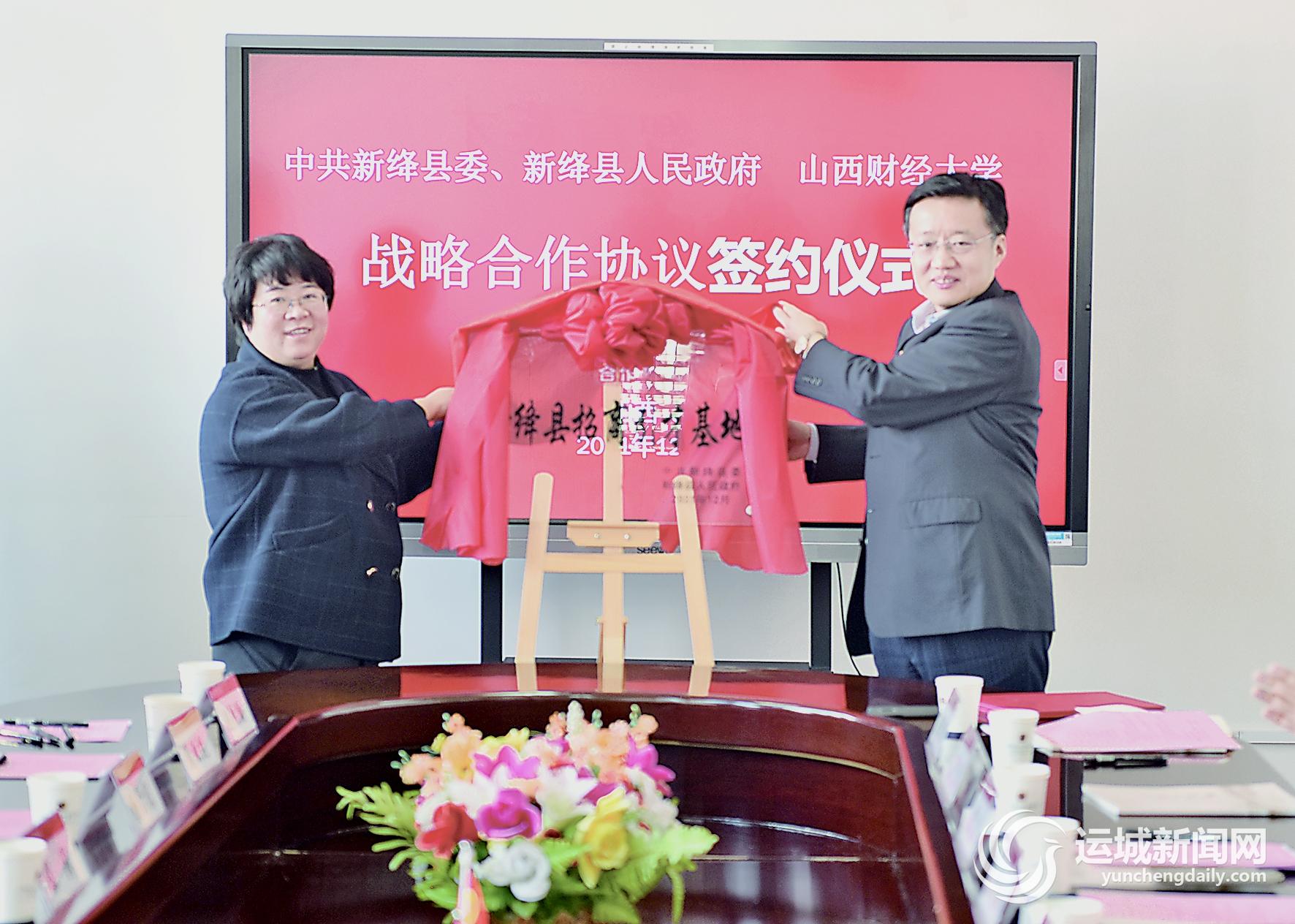 本报讯 12月6日和7日,新绛县与山西传媒学院、山西财经大学签署战略合作框架协议。新绛县委副书记、县长张琼出席活动,并为“新绛县招商引才基地”揭牌。