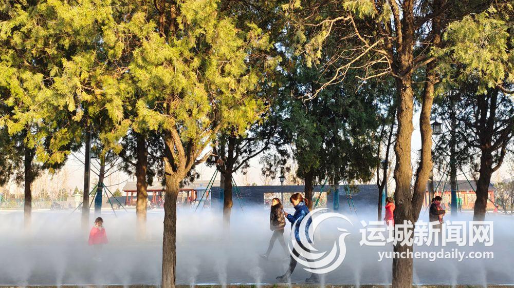 近日,刚改造完成的芮城县永乐公园(永乐宫文化广场)大门两侧的景观树中安装了喷雾系统。永乐宫大门前的景观大道在雾气下幻化为仙境园林,美不胜收,引得游客啧啧称奇、拍照留念。