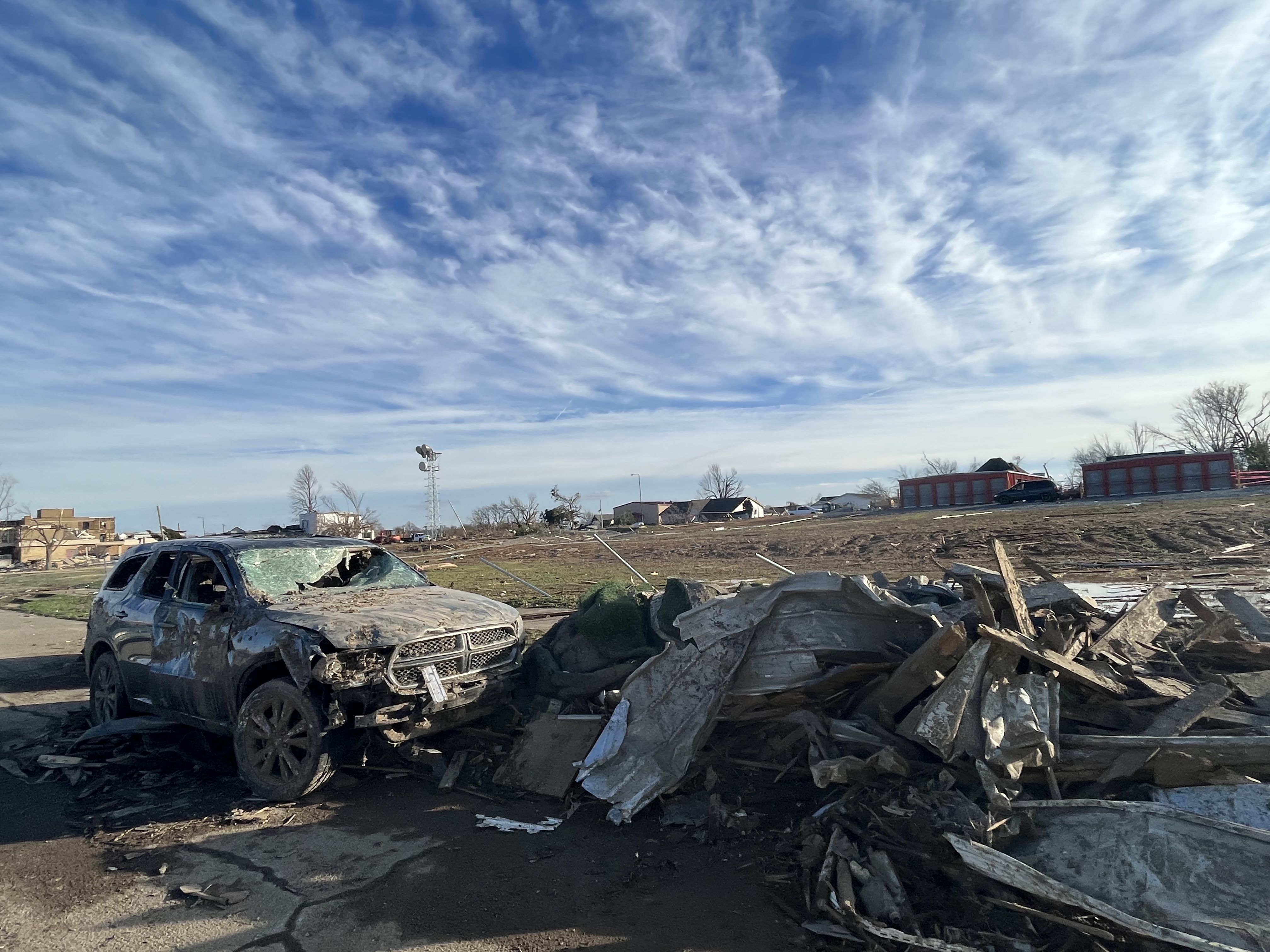 12月11日,在美国肯塔基州梅菲尔德,一辆汽车在龙卷风袭击中损毁。