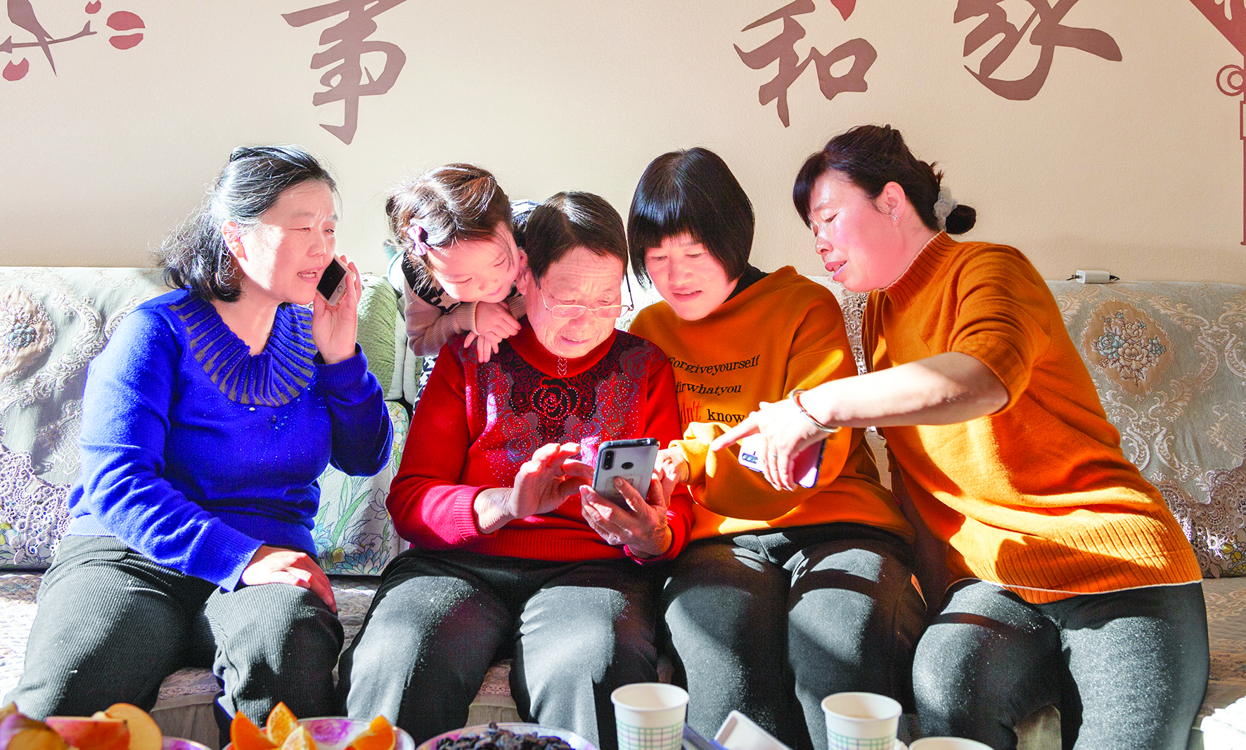 让景丛样跟上时代的步伐,让她从心底开心起来,是儿子儿媳们一直在做的事情。景丛样虽然有一部智能手机,但只会简单地接打电话。三儿媳每次回家,都会手把手教婆婆学习智能手机。现在景丛样不仅会用微信聊天,还学会了看抖音、移动支付。一家人聚在一起的时候,她还拍短视频上传到网上,记录幸福生活。景丛样高兴地说:“咱也赶上新时代了。”