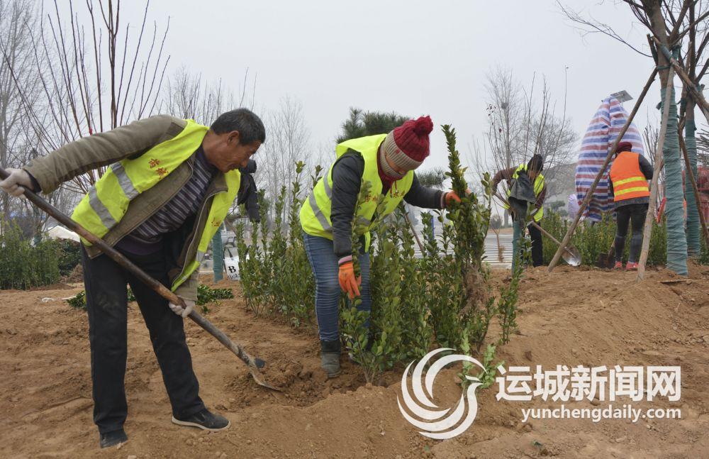 12月10日,黄河一号旅游公路芮城县凤凰咀至涧口段,绿化作业人员在进行冬青栽植。