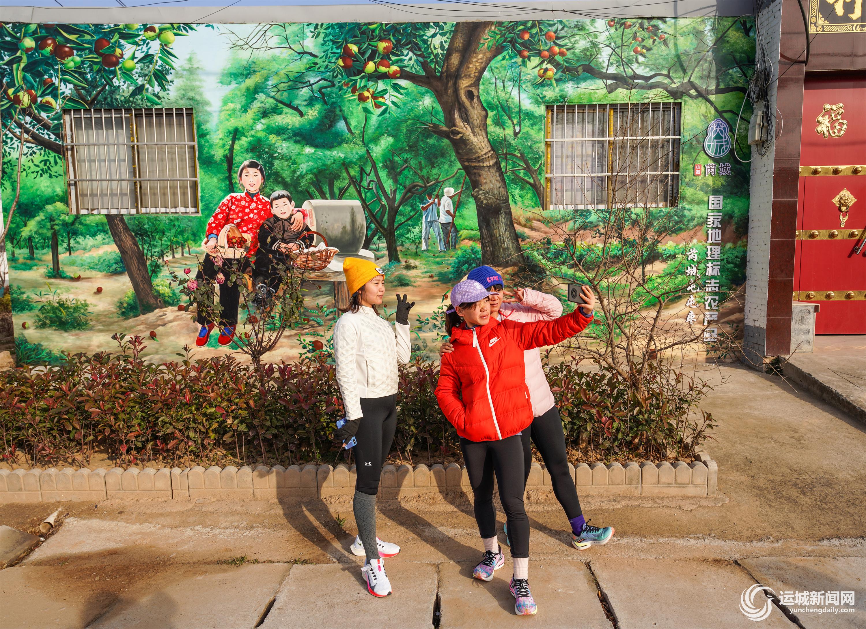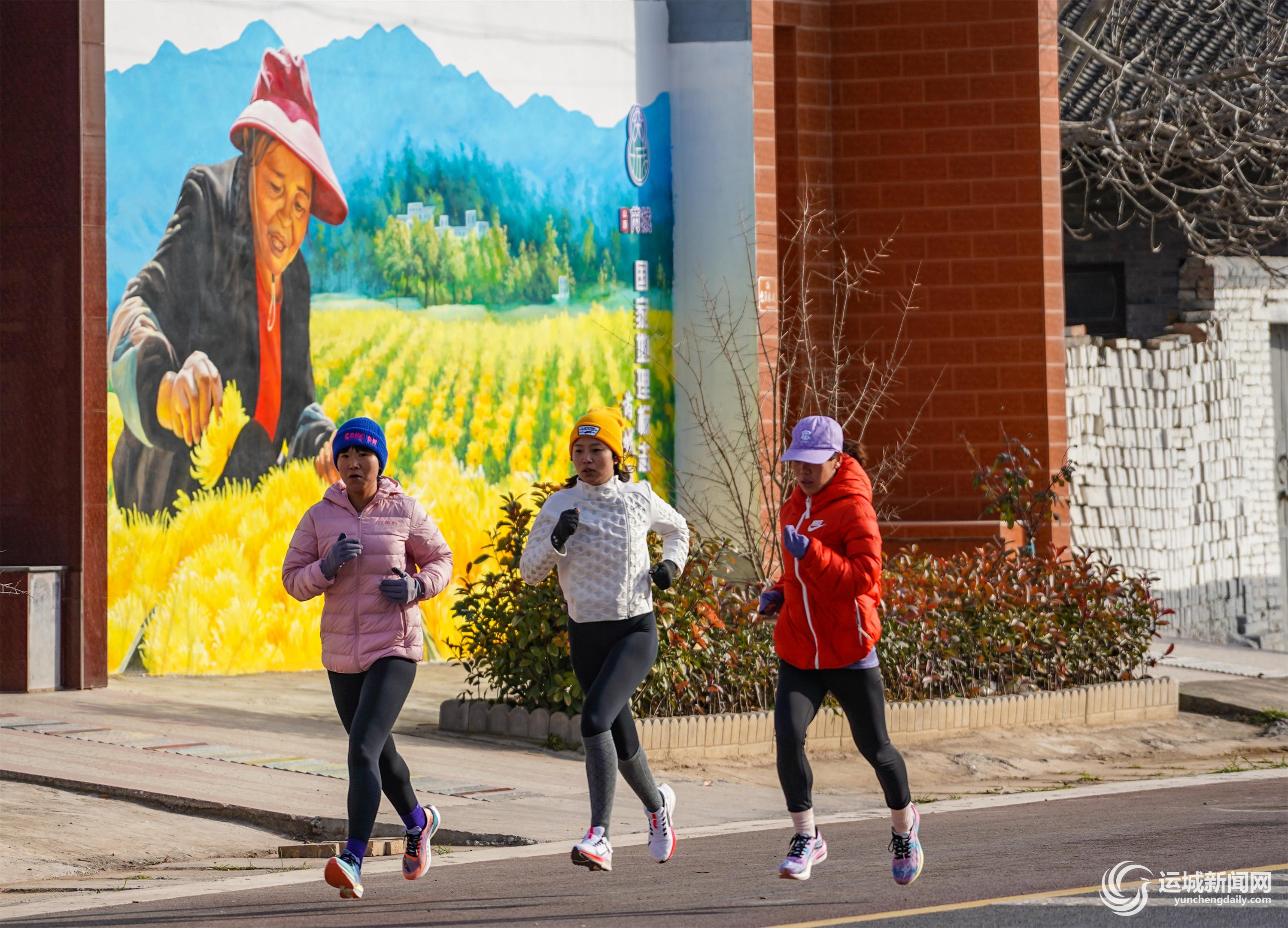 12月14日,路跑者从芮城县南磑镇大禹渡联村周青自然村一幅彩色墙绘旁经过。 记者 陈方斌 摄