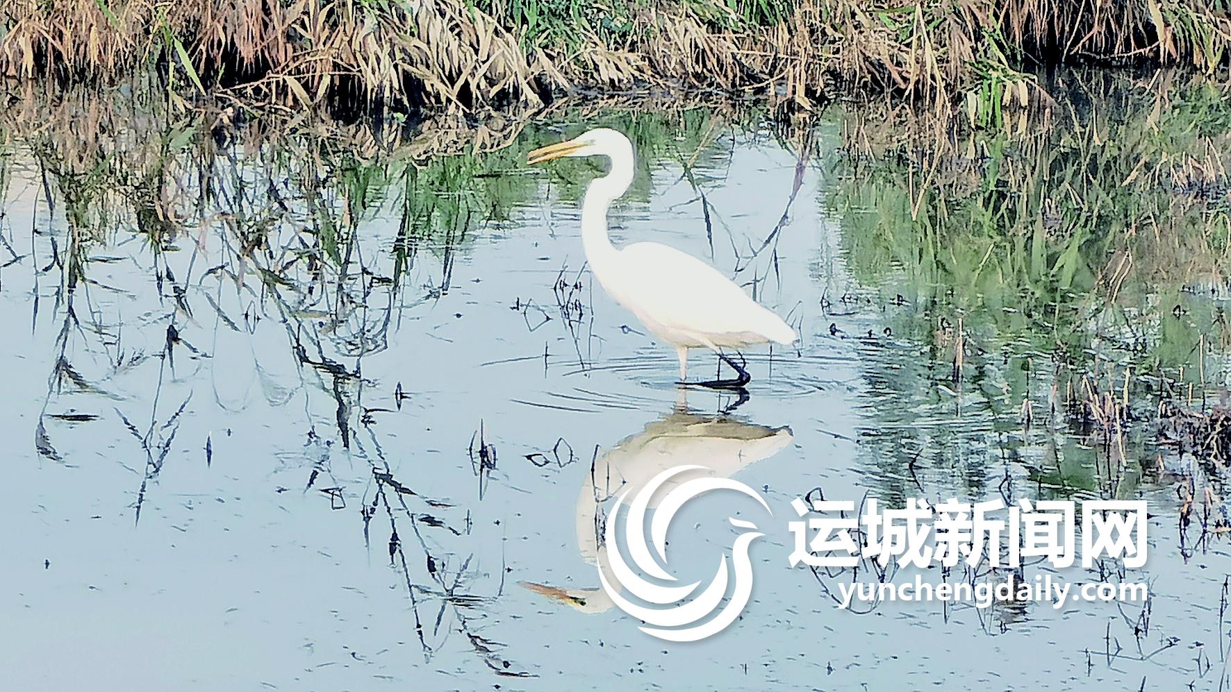 ▲近日,一只白鹭在闻喜体育公园池塘里觅食。