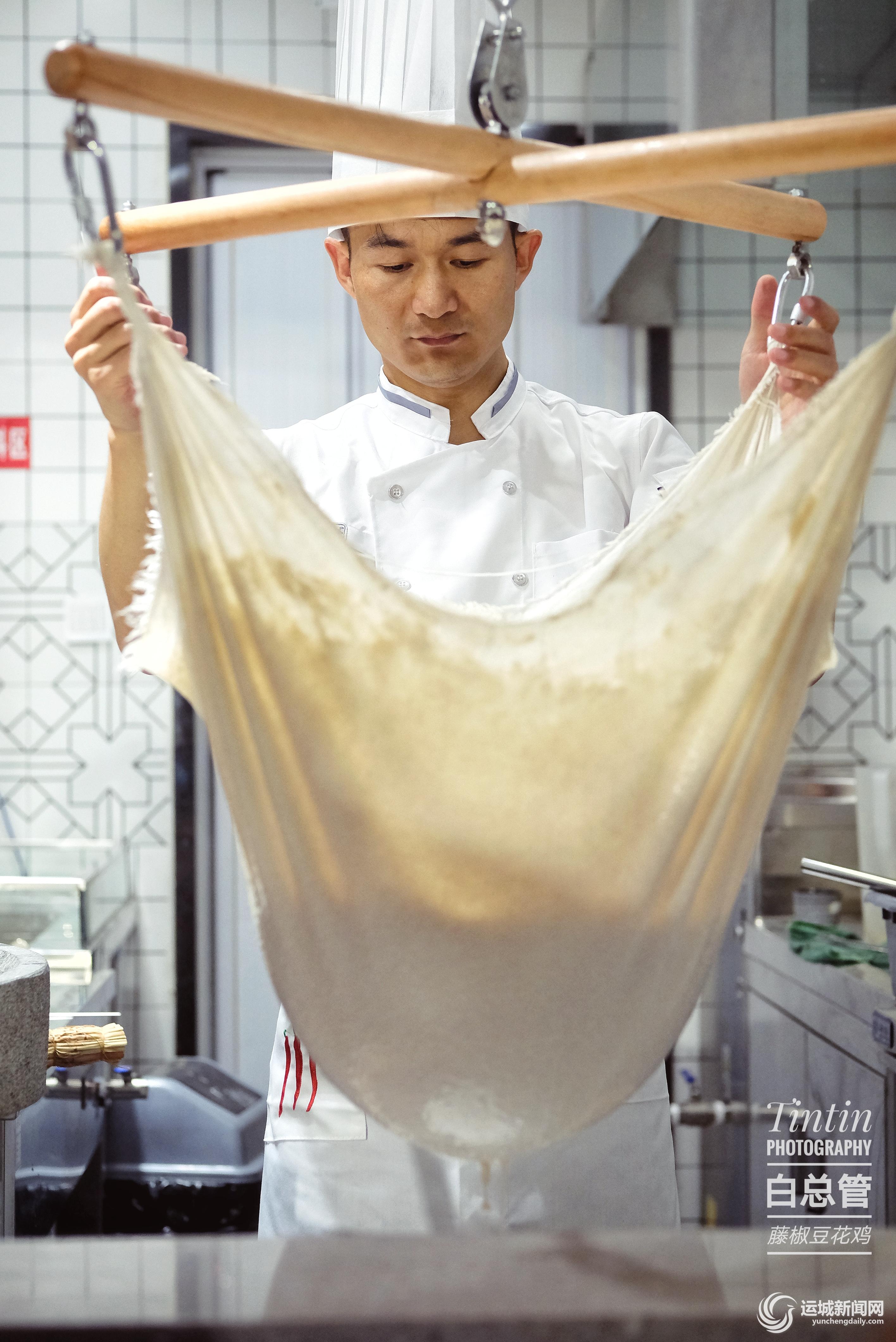 白总管藤椒豆花鸡,为了让食客直观感受来自四川皮薄粒小的黄豆是如何一步步通过石磨变成口感醇香的豆花,店家直接在店门口设置了明档,使豆花和豆浆的整个制作过程一目了然。
