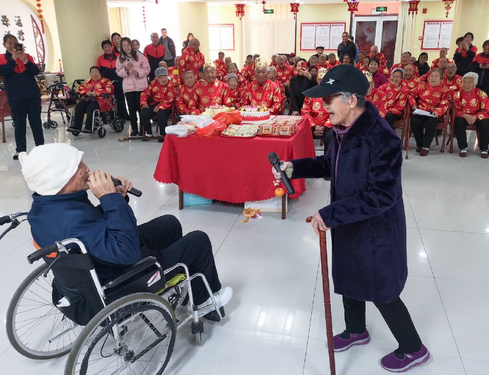 12月15日,在万荣县中企联发养老服务中心,两位入住老人自编自演的小品《看望老朋友》引得观众笑声连连。