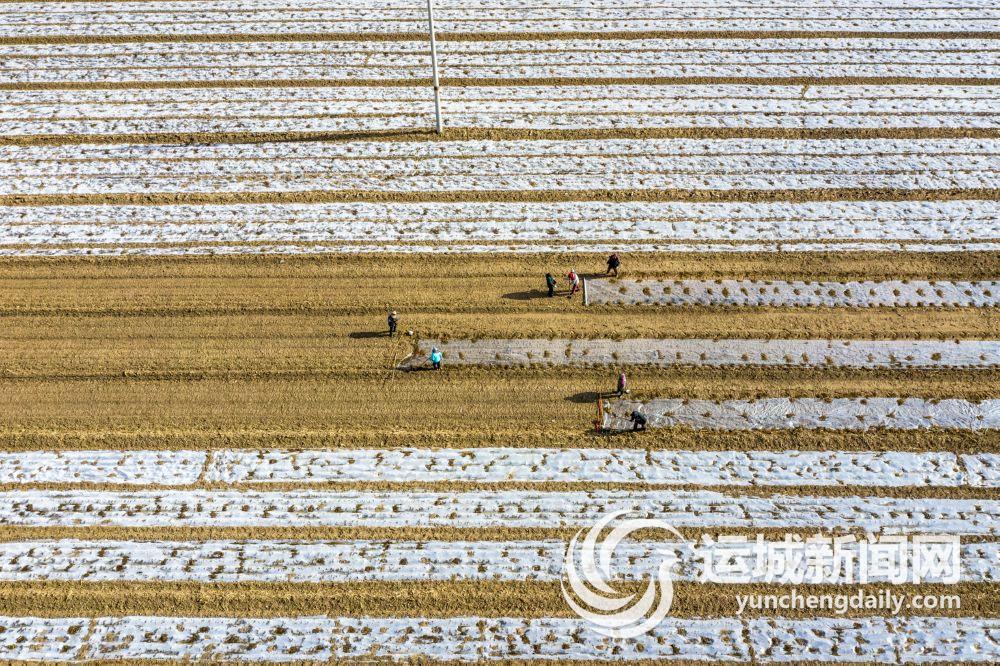 ▲12月16日,河津市城区街道黄村村民在汾河滩涂为晚播的冬小麦覆盖地膜。
