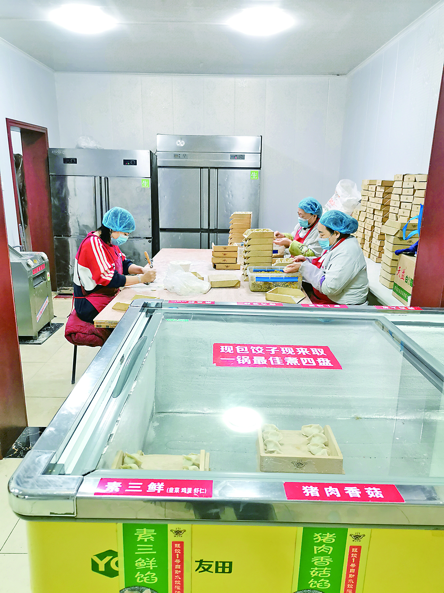 12月18日是周六,记者看到,旺饺①号宽敞整洁的就餐大厅里座无虚席,有一家五六口的;有三三两两好友结伴而来的;也有附近工地干活的工人团餐的……“明厨亮灶”式的窗口,能看到大厨和面案师傅穿戴整洁,在操作间忙碌着。服务员将一屉又一屉现包的大饺子,有序地归置在冷藏柜内对应的标签处,方便顾客依据自己的喜好快速取餐。在冷藏柜内,记者看到整齐地摆放着猪肉莲菜、猪肉韭菜、猪肉香菇、猪肉芹菜、猪肉大葱、羊肉胡萝卜、素三鲜、萝卜鸡蛋8种馅料的手工水饺。每一屉盛放了8个饺子,在冷藏柜上,还贴了小贴士,提示顾客“现包饺子现来取 一锅最佳煮四盘”。