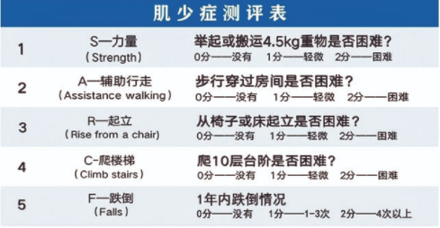 张国梁介绍,肌少症是与增龄相关的、全身骨含量进行性减少,同时伴有功能下降的一组老年综合征。其临床表现为:肌力减退、活动能力下降,日常坐立、行走等动作完成困难;易发生跌倒,骨质疏松或者骨折;乏力、衰弱、手部力量差,严重时则会长期卧床。