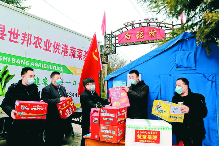 2021年12月31日,夏县世邦农业开发有限公司负责人和员工带着抗疫物资,来到该县尉郭乡、禹王镇下辖的白张、西董、郭里等村,慰问基层抗疫人员。张秀峰 摄
