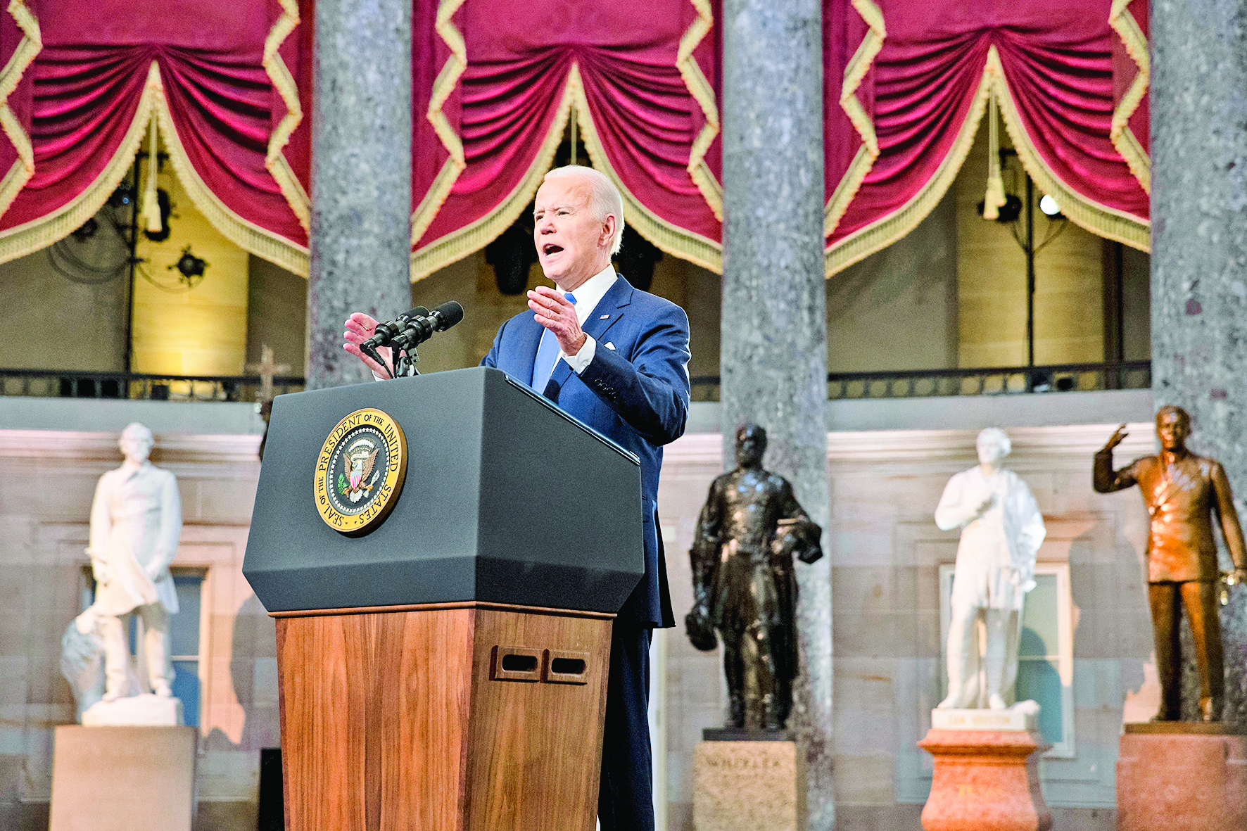 1月6日,美国总统拜登在华盛顿国会大厦发表讲话,纪念国会山骚乱事件一周年。 2021年1月6日,数千名美国民众聚集在华盛顿国会山并强行闯入国会大厦,试图阻止美国国会联席会议确认美国新当选总统。骚乱事件造成包括一名国会警察在内的5人死亡、约140名执法人员受伤。