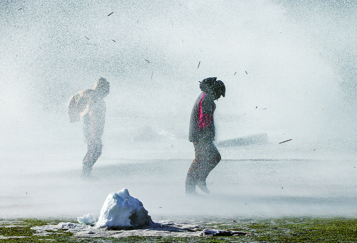 1月7日,在加拿大温哥华,人们站在英吉利湾的风浪中。加拿大大温哥华地区遭受暴风侵袭,多地停电,部分渡轮停航。