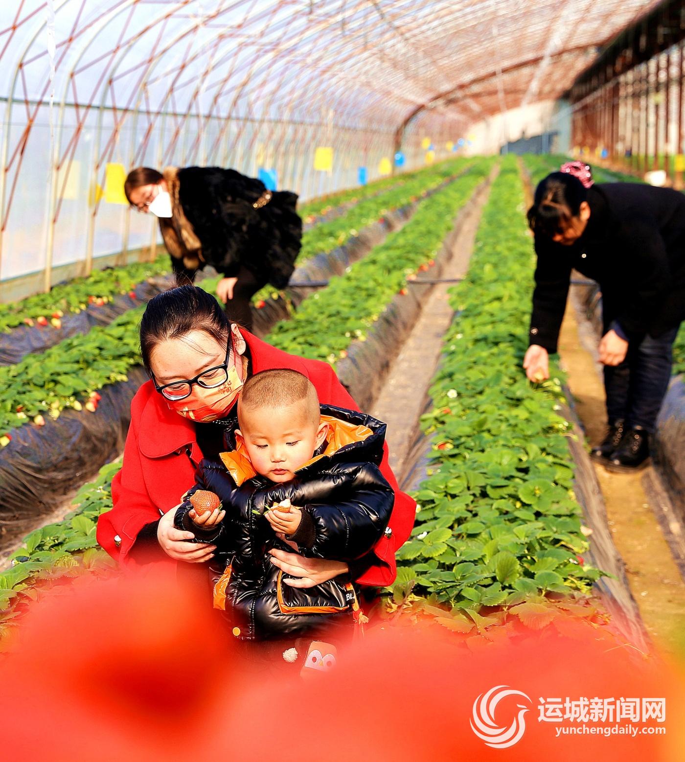 1月10日,游人在夏县裴介镇朱吕村设施大棚内采摘草莓。