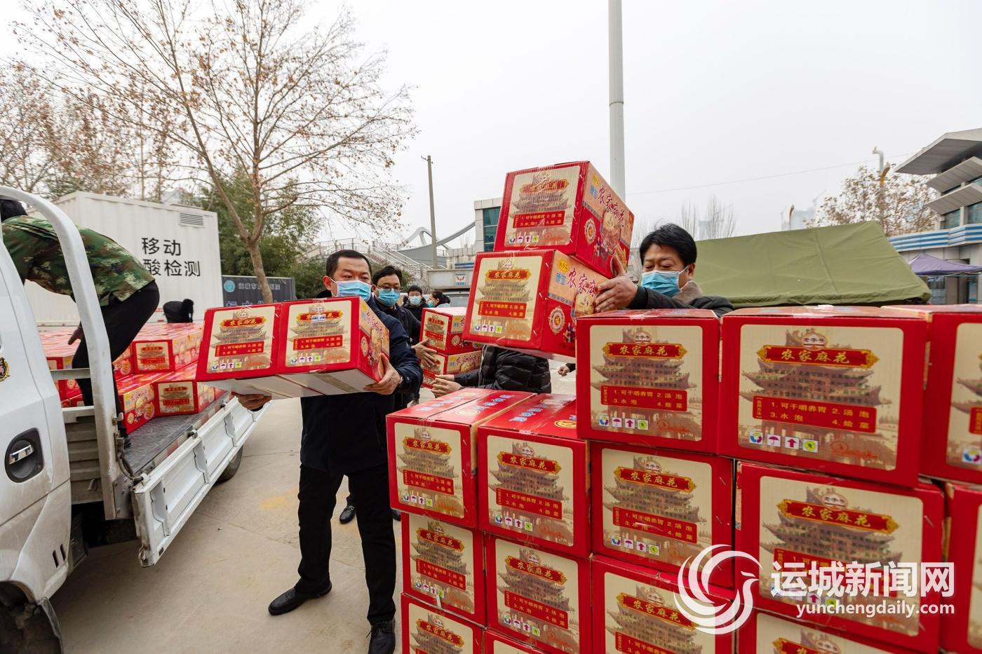 1月8日,工作人员在运城市第二医院搬运慰问品。