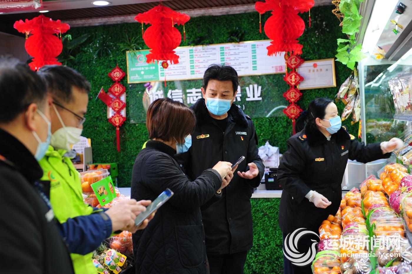 1月10日,稷山县市场监管人员在水果店检查进口水果票据。 连日来,该县市场监督管理局进一步加强市场疫情防控监管,努力做到统筹市场开放和疫情防控“两不误、两促进”,确保全县人民过一个安全、文明、祥和的新春佳节。薛建磴 摄