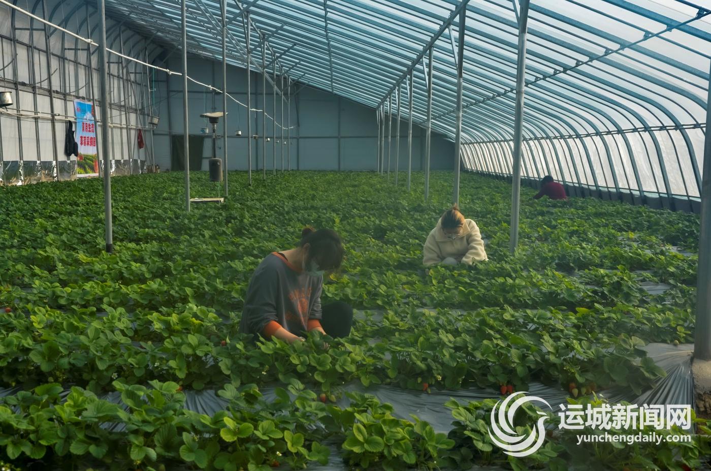 1月9日,游客在万荣县南月生态园的奶油草莓园里采摘草莓。