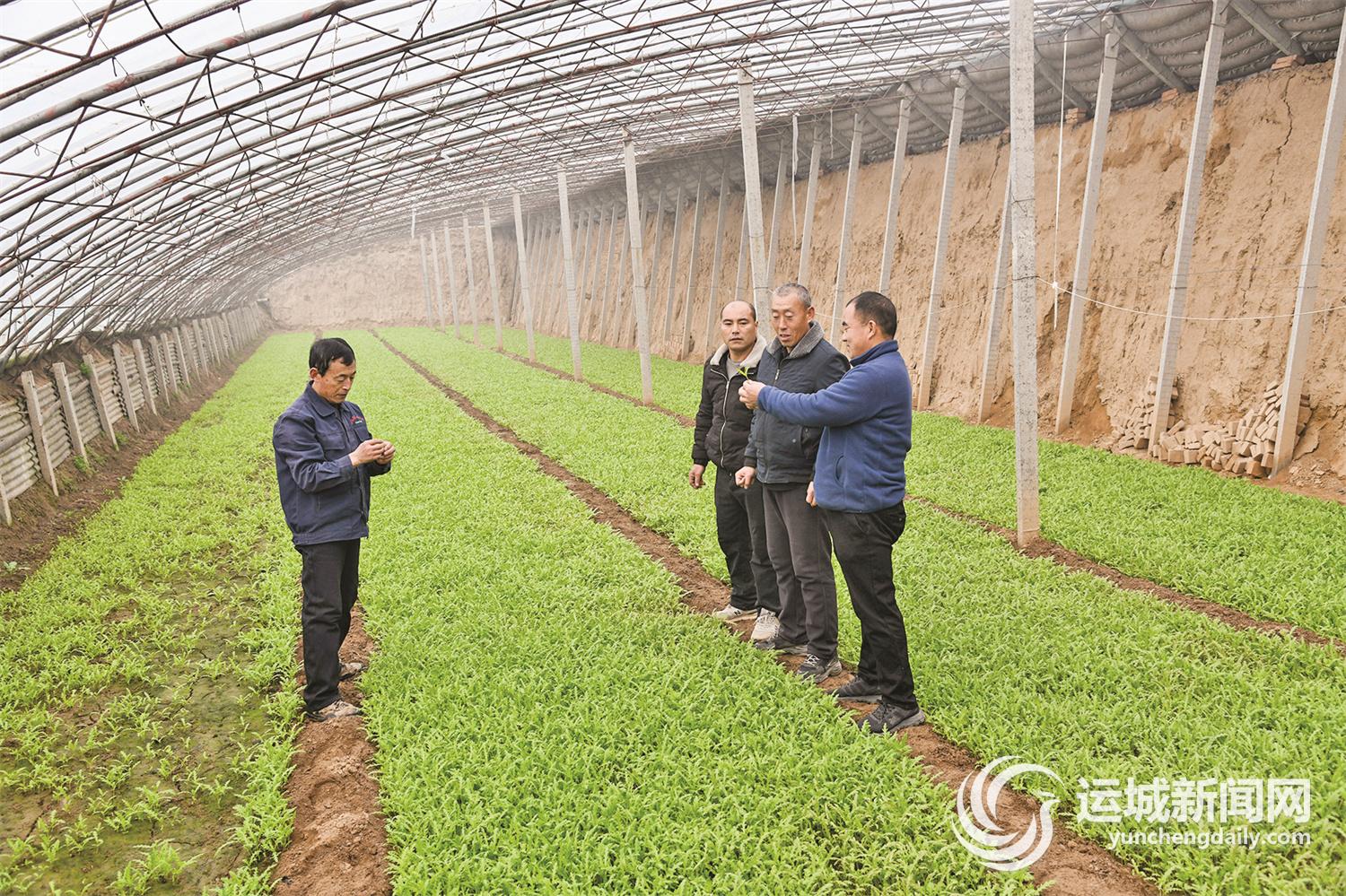 1月11日,闻喜县桐城镇下邱村口福蔬菜种植专业合作社社员在育苗大棚里交流育苗技术。 下邱村口福蔬菜种植专业合作社经过多年发展,目前已辐射吸纳6个村庄130户种菜能手、种菜大户加入,发展蔬菜面积1500亩,走上了“产出高效、产品安全、绿色生态、增收致富”的新路。 特约摄影 温徐旺 摄