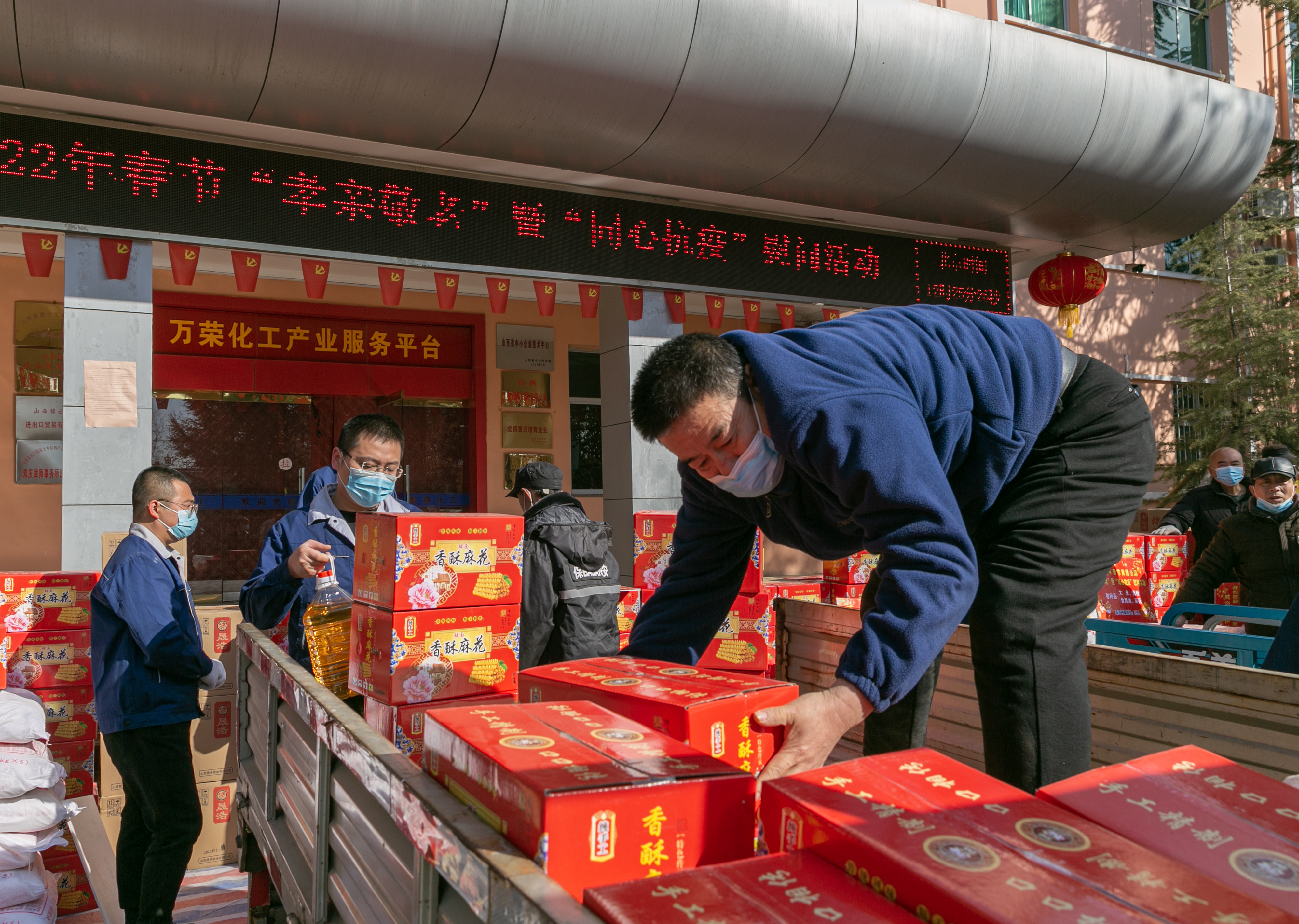 1月13日,位于万荣县荣河镇荣河村的山西黄腾化工有限公司举行“孝亲敬老 同心抗疫”慰问品发放仪式,将总价值15万元的620份慰问品,送给荣河村70岁以上老年人和荣河镇疫情防控卡口上的值班人员。这是该公司连续18年慰问荣河村老年人。图为该公司员工将慰问品装车。记者 薛俊 摄