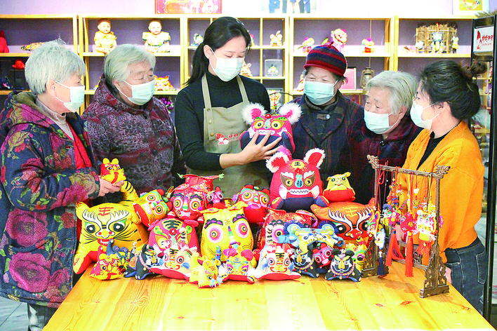 1月14日,山西“姥姥和我”文化传承有限公司员工和务工妇女交流布老虎制作工艺技能。 该公司多年来坚持帮扶农村和易地搬迁的妇女,通过培训传技能、项目签订单等途径,使450多名妇女长期有活干、居家能增收。如今,该公司的产品有400余种,全国线上线下的代理商有360多名,产品远销加拿大、马来西亚等国家。