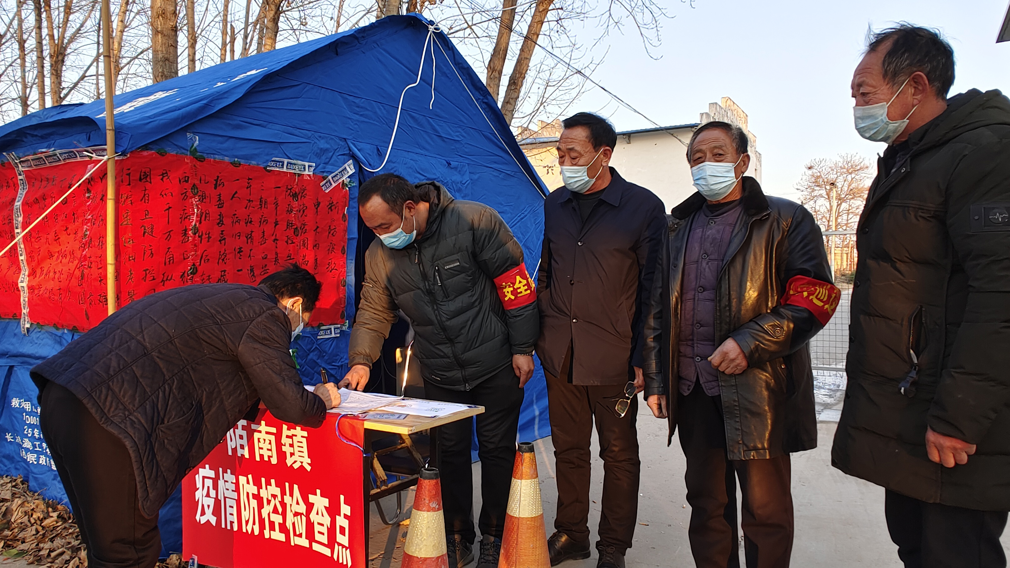 1月14日,芮城县陌南镇东夭村党支部书记杜康雷(中),在南堡自然村疫情防控点和党员一道值班。