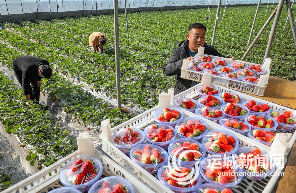 1月12日,绛县大交镇大交村浍阳草莓种植专业合作社的农户在采摘、包装草莓。目前,该合作社流转土地460亩,建设草莓大棚74座,涉及农户66户,解决农村富余劳动力200余人。近年来由于草莓市场行情较好,再加上合作社种植户积极投入、精心管理,亩均可收入6万元左右,该合作社也成为带动当地农民增收致富的一个优秀典型。 记者 金玉敏 摄