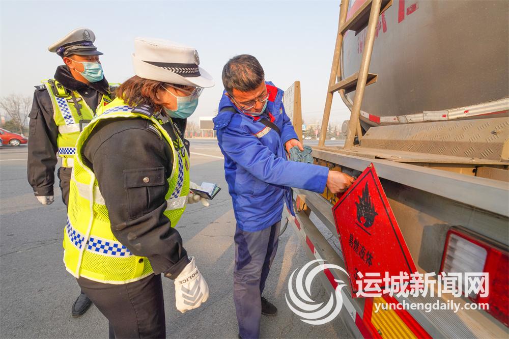 盐湖交警大队民警在姚孟春运检查站对重点车辆进行检查。