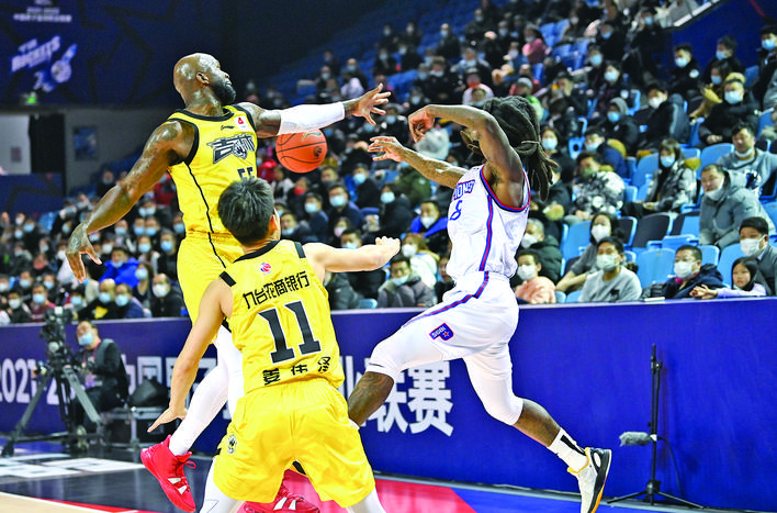 ▲1月16日,九台农商银行队球员琼斯(左)与天津先行者队球员伯顿(右)在比赛中拼抢。 当日,在吉林长春进行的2021-2022赛季中国男子篮球职业联赛(CBA)第二阶段第23轮比赛中,天津先行者队以101比99战胜吉林九台农商银行队。新华社记者 颜麟蕴 摄