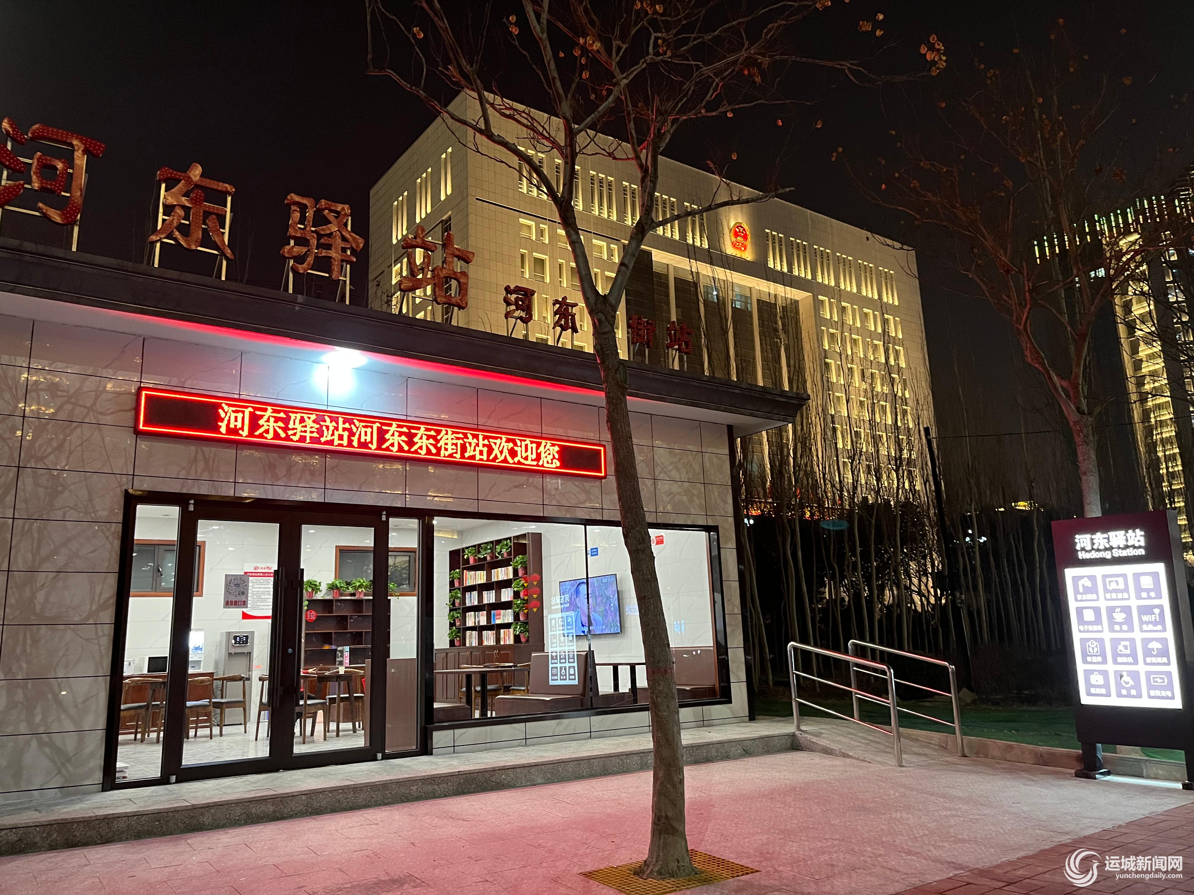 此外,驿站在夜间有亮化设施,夜间的河东驿站,明亮的指示牌和“河东驿站欢迎您”屏幕,引导有需要的市民和户外劳动者前来享受便民服务。