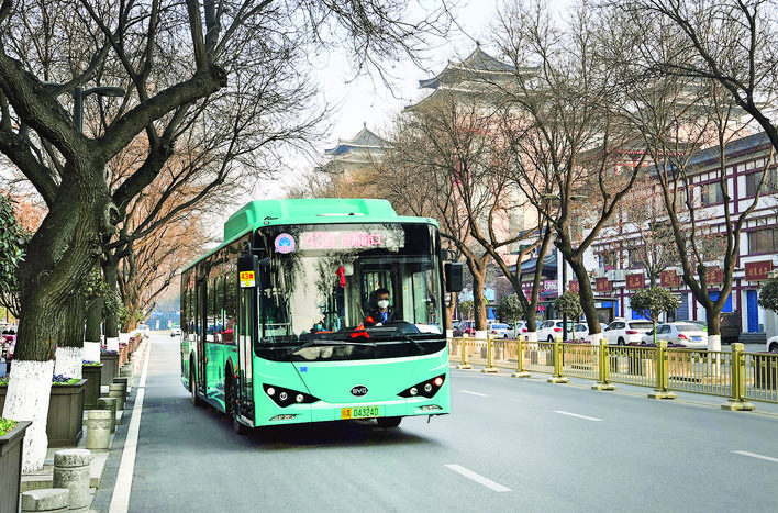 1月18日,一辆公交车行驶在西安市西大街上。 随着西安市疫情防控形势向好发展,部分区域陆续解封,西安公交集团在落实疫情防控要求的前提下,逐步、有序恢复低风险区域公共交通运力。