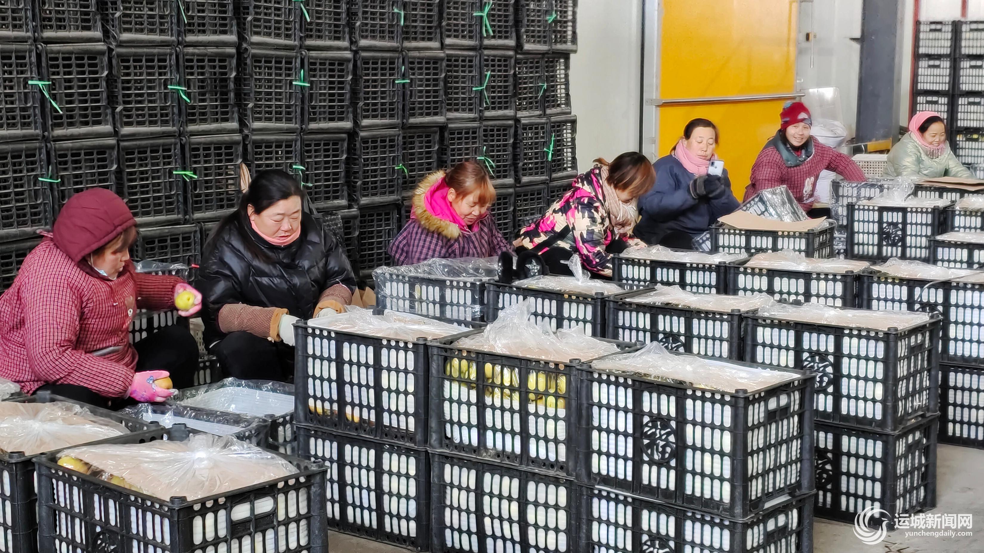 1月17日,村民在芮城县宇恒恒温果库包装外销苹果。