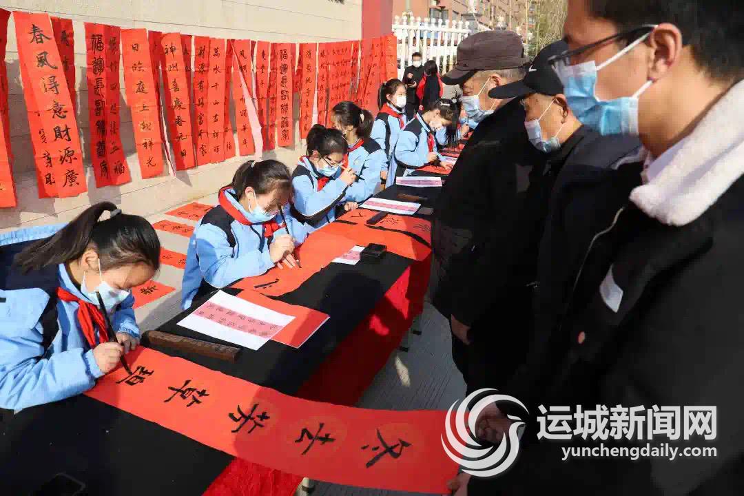 运城晚报讯(记者 寻霄)撑天拄地两行字,纳古涵今一副联。1月16日,盐湖区魏风小学书法组的老师和学生,在校门口为附近居民书写春联(上图),送上新春祝福。
