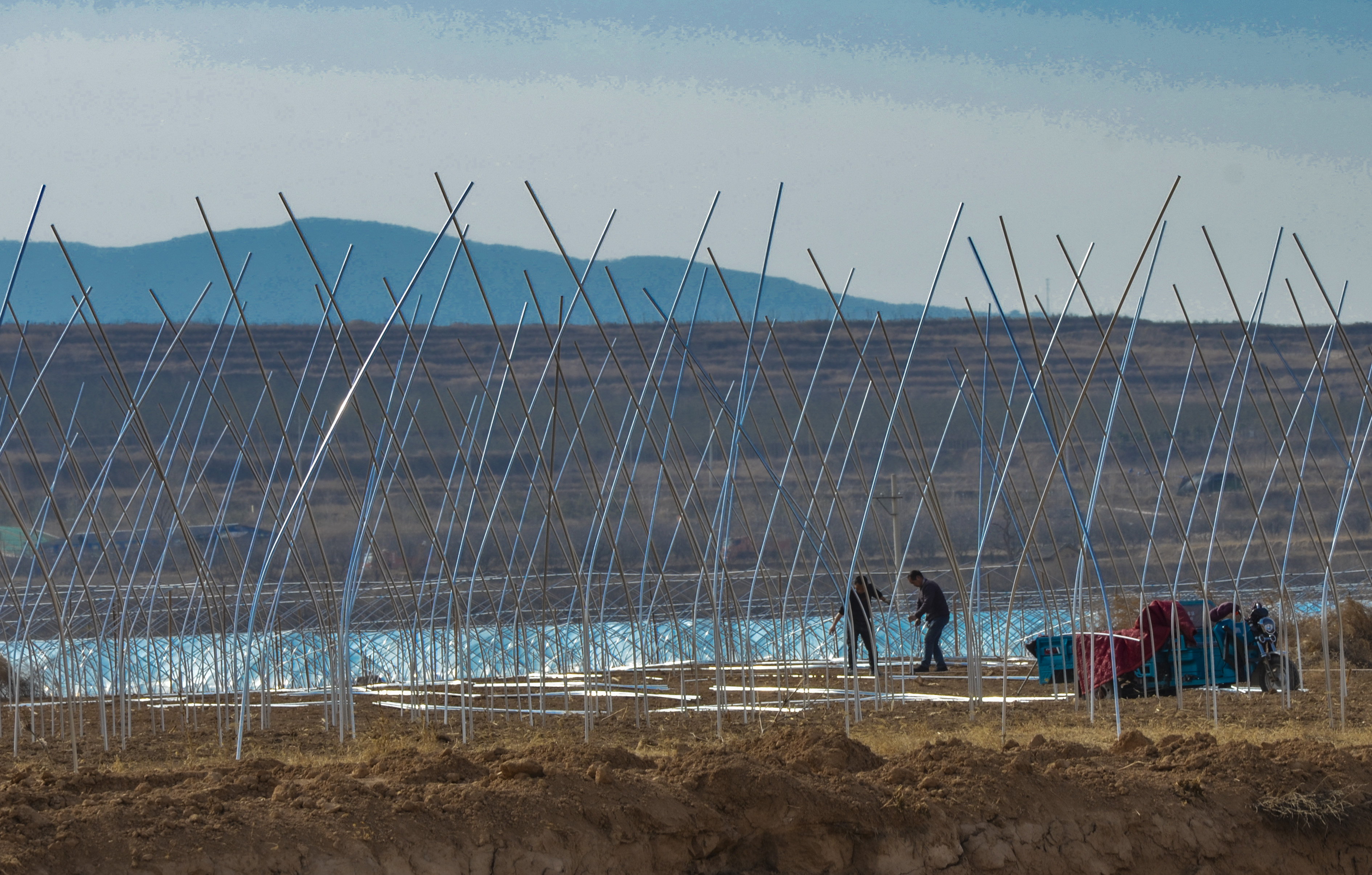 1月15日,万荣县王显乡大棚西瓜种植专业合作社的社员在该县南解村建西瓜大棚。