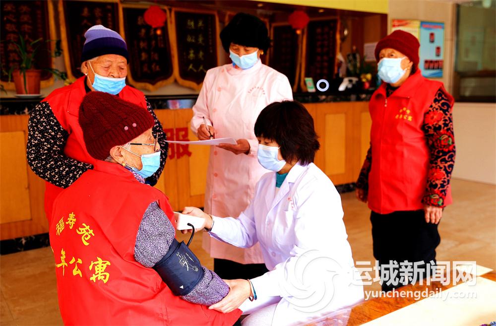 1月18日,夏县福寿苑老年公寓工作人员在给老年人测量血压。