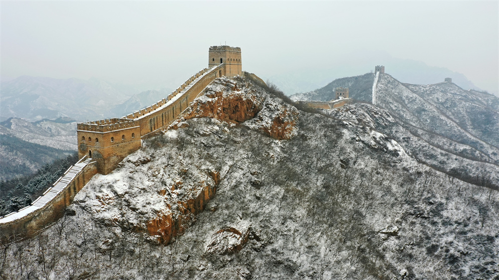 这是1月22日拍摄的雪后河北承德金山岭长城(无人机照片)。