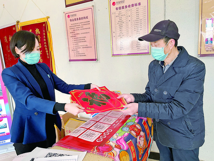 运城晚报讯(记者 樊亚楠)1月22日,运城市天宝物业管理有限公司举办“迎新春写春联送年历”活动,为辖区居民赠送新春大礼包,里面包括春联、“福”字、窗花等物品(上图)。
