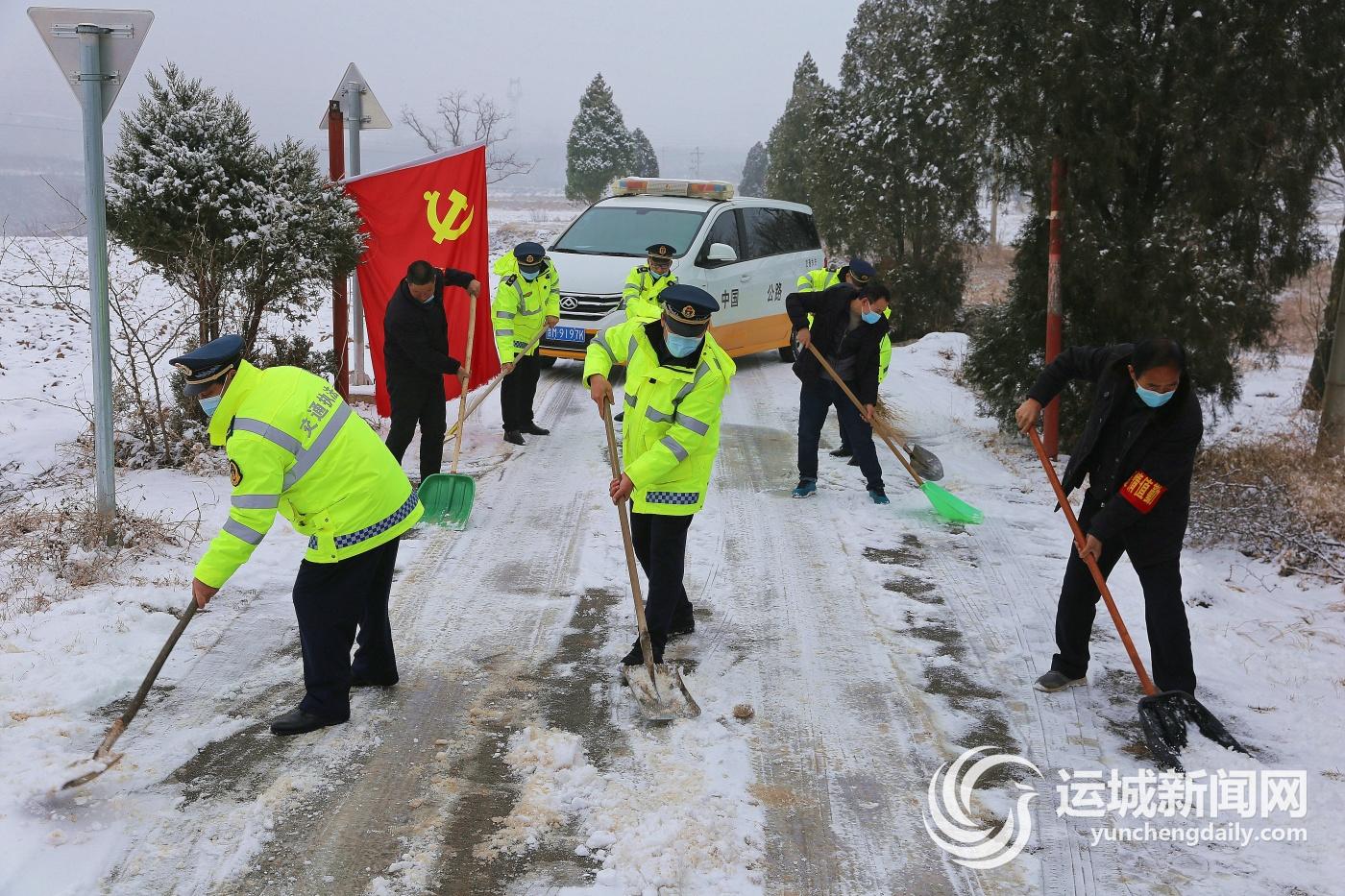 1月24日,夏县交通运输综合行政执法队工作人员在瑶台山景区卡口,与附近瑶峰镇上焦村疫情防控岗上的党员干部一起清除路面积雪。