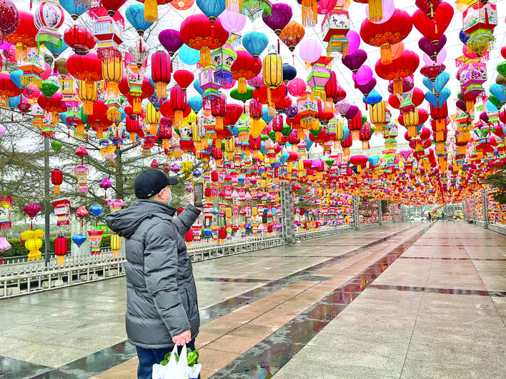 ▲市区南风广场,市民拍摄花灯长廊留念。