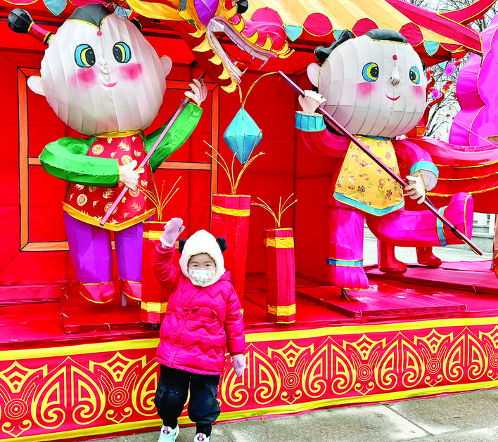 ▲市区航天公园门口,孩子在“娃娃”造型花灯前留影。